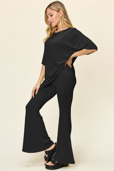 Double Take Full Size Round Neck Drop Shoulder T-Shirt and Flare Pants Set