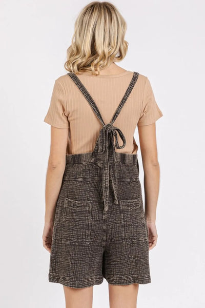 The Textured Knotted Wide Strap Overalls is a trendy and chic outfit choice. The textured fabric adds depth and visual interest to the romper, making it a stylish statement piece. The knotted detail on the wide straps adds a unique touch to the design, while the romper style offers a playful and feminine look. Perfect for warm weather or casual occasions, this romper can be dressed up with heels and accessories or dressed down with sandals for a more relaxed vibe. Its versatile style and on-trend details make it a versatile and fashionable addition to your wardrobe.