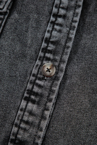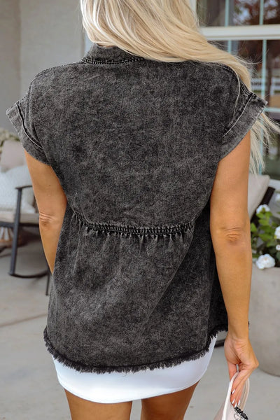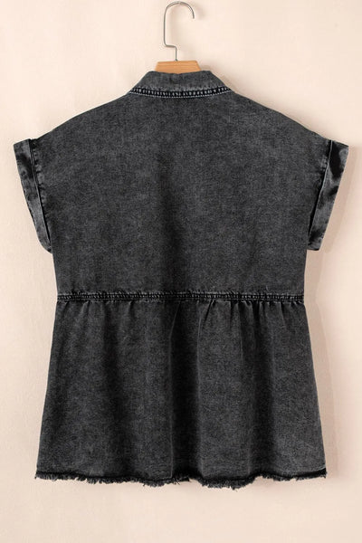 Short Sleeve Flap Pocket Button Up Raw Hem Denim Shirt