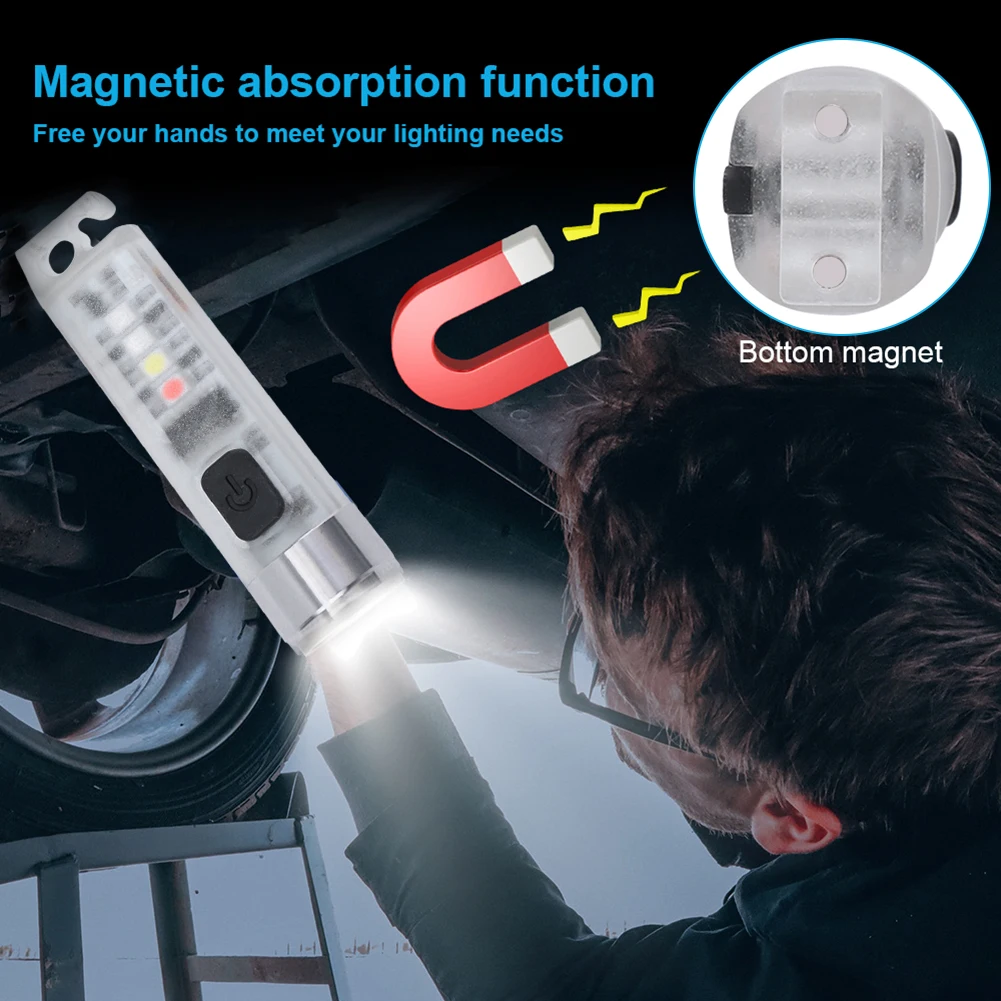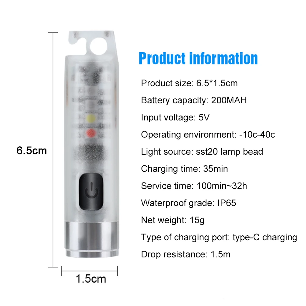 Feature: 1. The size is small and lightweight, suitable for EDC use, and weighs only about 15g. 2. It can be hung on the key or put in a pocket, backpack or purse, etc., which is very convenient. 3. It consists of main light and side light, with 12 lighting modes; main light (super bright-high light-medium light-low light-energy-saving-strobe), side light (white light, white light burst, UV purple light, red light) light, red light burst flash, red and blue warning flash). 4. The charging time is short and the battery life is long. It only takes 35 minutes to complete the charging. The battery life in the super bright mode can be up to 100 minutes, and the energy saving mode can be used for up to 32 hours. 5. Very suitable for outdoor activities such as cycling, hiking, and camping. Specification: Shell material: Fluorescent PC Product size: 6*1.5cm/2.36*0.6in Battery capacity: 300mAh Input voltage: 5V Operating environment: -10C-40C Light source: SST20 lamp beads Charging time: 35min Use time: 90min~32H Waterproof rating: IP65 Net weight: 15g Charging port type: TYPE-C charging Falling resistance: 1.5 meters/4.92ft Color: Fluorescent Note: Due to the different monitor and light effect, the actual color of the item might be slightly different from the color showed on the pictures. Thank you! Please allow 1-2cm measuring deviation due to manual measurement. ![]()
